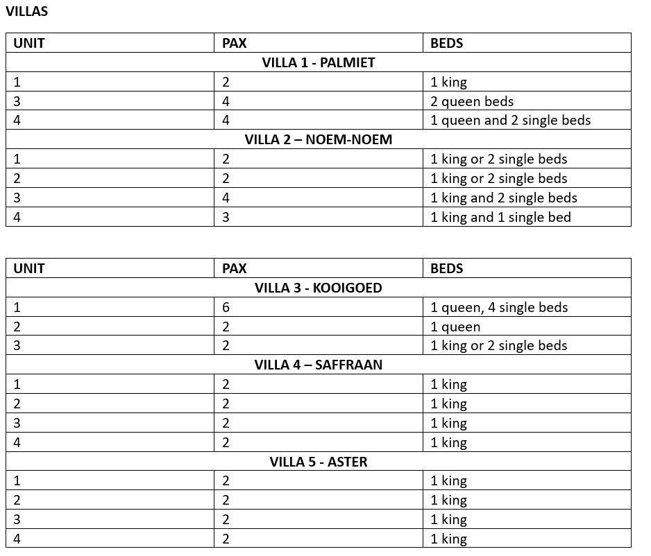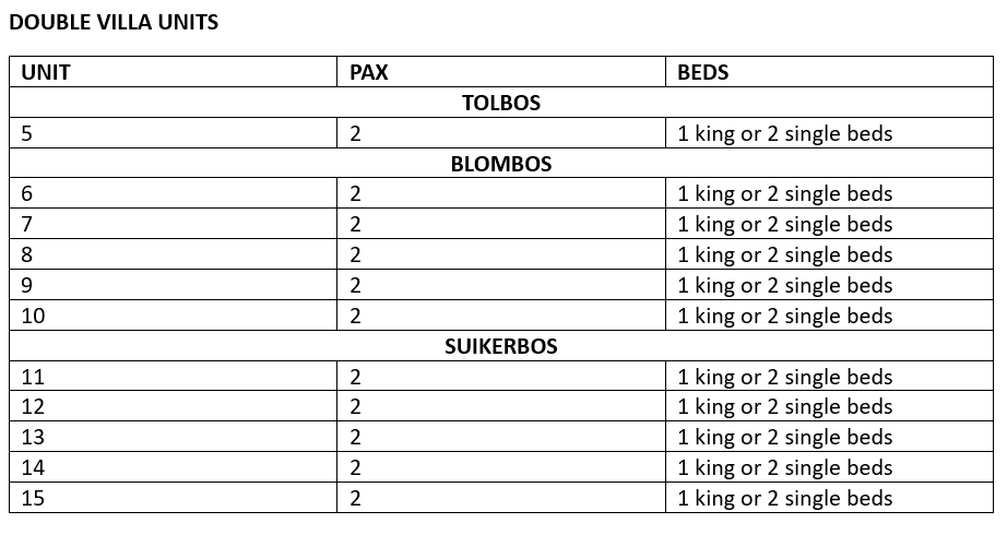 We are all staying at the venue! Please book your spot by sending an email with your selection to info@gourikwa.co.za. Reference: Janie&NeilTroue