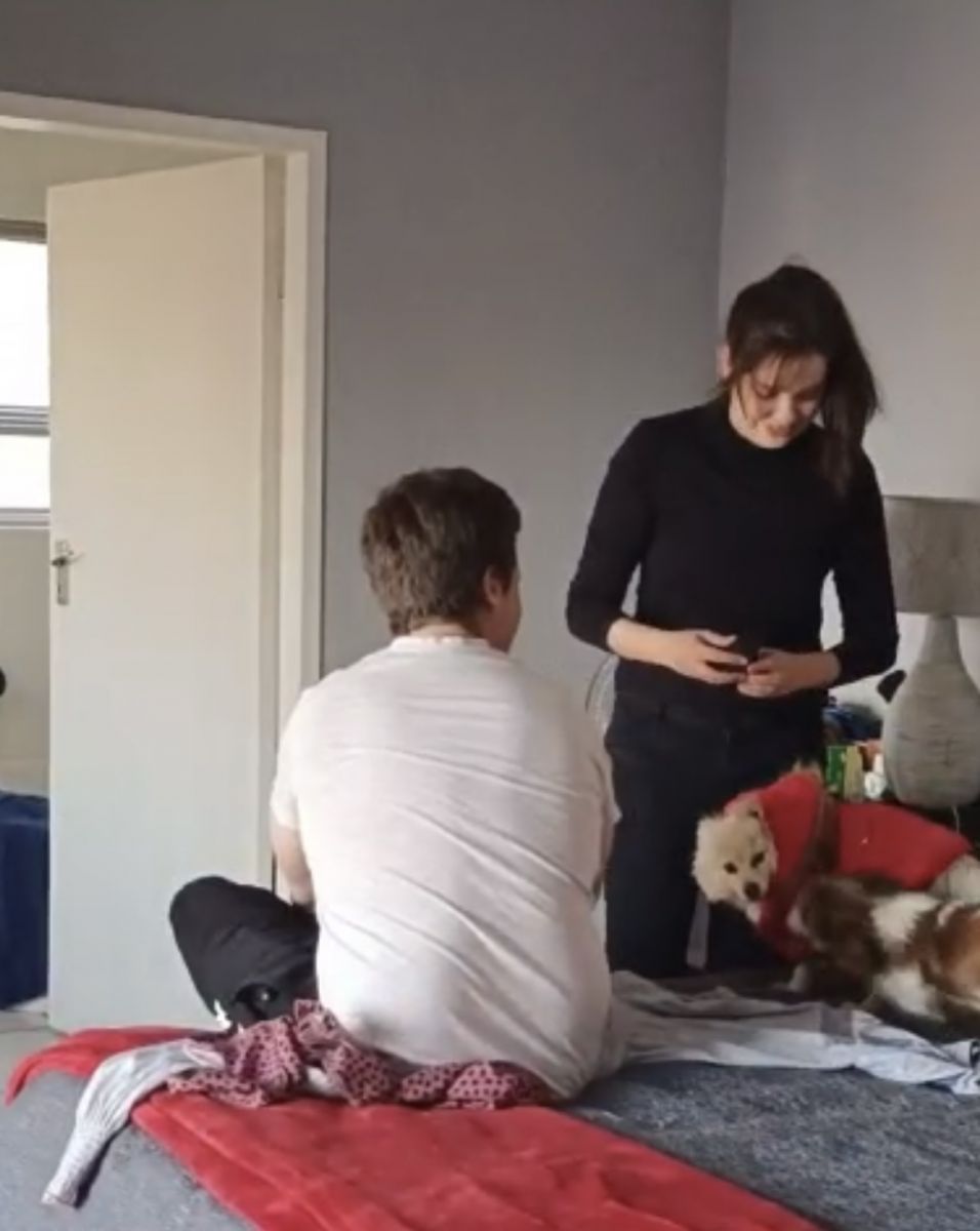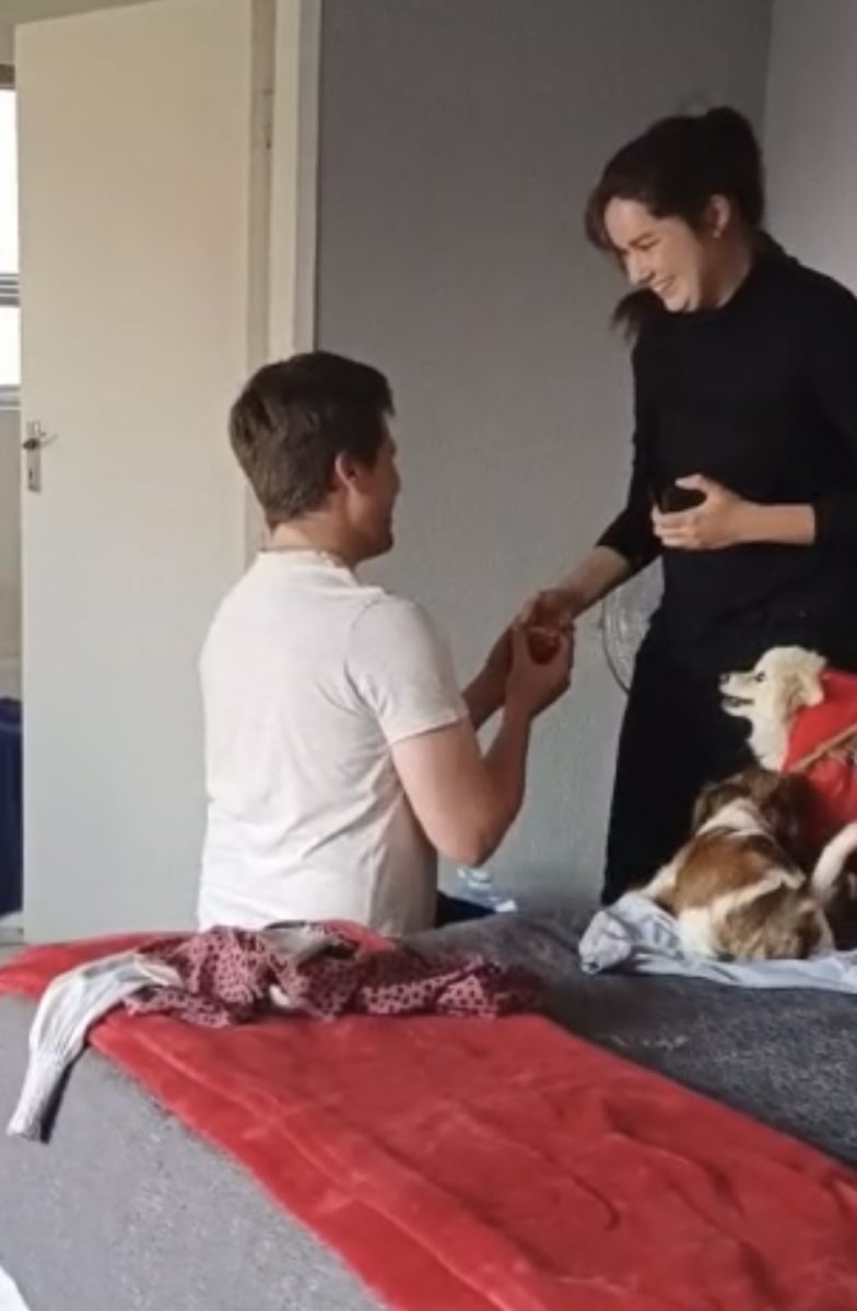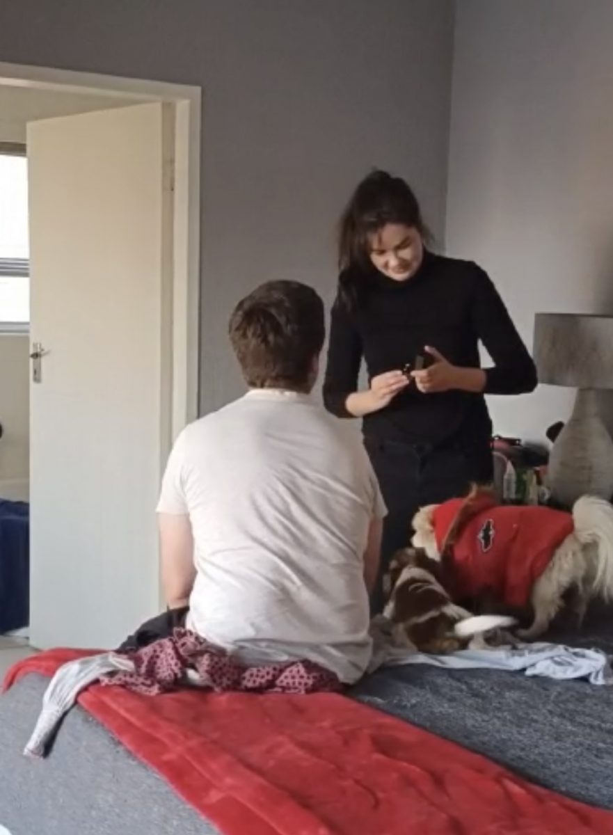 Na amper 3 jaar saam, het Neil besluit om die ja-woord te vra! Janie het geen idee gehad dat hulle besig was om ‘n ring te ontwerp nie. Dinsdag, 22 Augustus, het Neil se ma gearriveer met die ring in Alberton. Hy was so op sy senuwees dat hy besluit het die verlowing moet NOU gebeur. Wolkie het die ring in sy Top Gun baadjie se sakkie weggesteek. Janie was super verbaas om nie ‘n naamplaatjie vir Wolkie in die boksie te sien nie! Gelukkig het Neil die verwarring gestop en op sy knie gegaan.